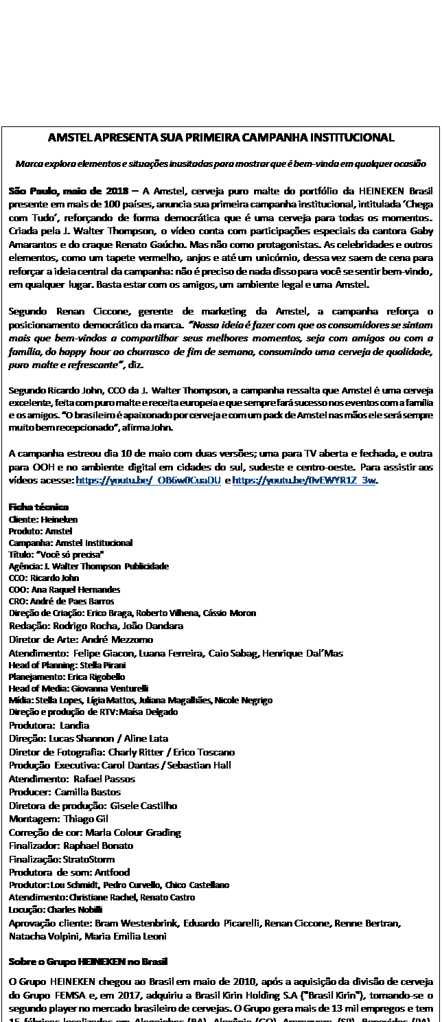 Segundo Renan Ciccone, gerente de marketing da Amstel, a campanha reforça o posicionamento democrático da marca. “Nossa ideia é fazer com que os consumidores se sintam mais que bem-vindos a compartilhar seus melhores momentos, seja com amigos ou com a família, do happy hour ao churrasco de fim de semana, consumindo uma cerveja de qualidade, puro malte e refrescante”, diz.