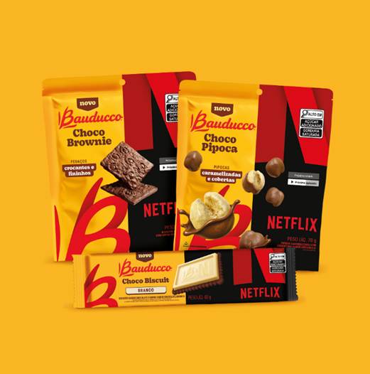 Além dos lançamentos inéditos, a parceria traz também uma edição especial do Choco Biscuit nº 1 do Brasil, o Bauducco® Choco Biscuit Branco com biscoito escuro e ícones exclusivos na barra que traduzem a união das duas marcas. Todos foram desenvolvidos para serem o “par perfeito” para assistir à programação da Netflix e são os primeiros snacks doces desenvolvidos em collab com o serviço de streaming .