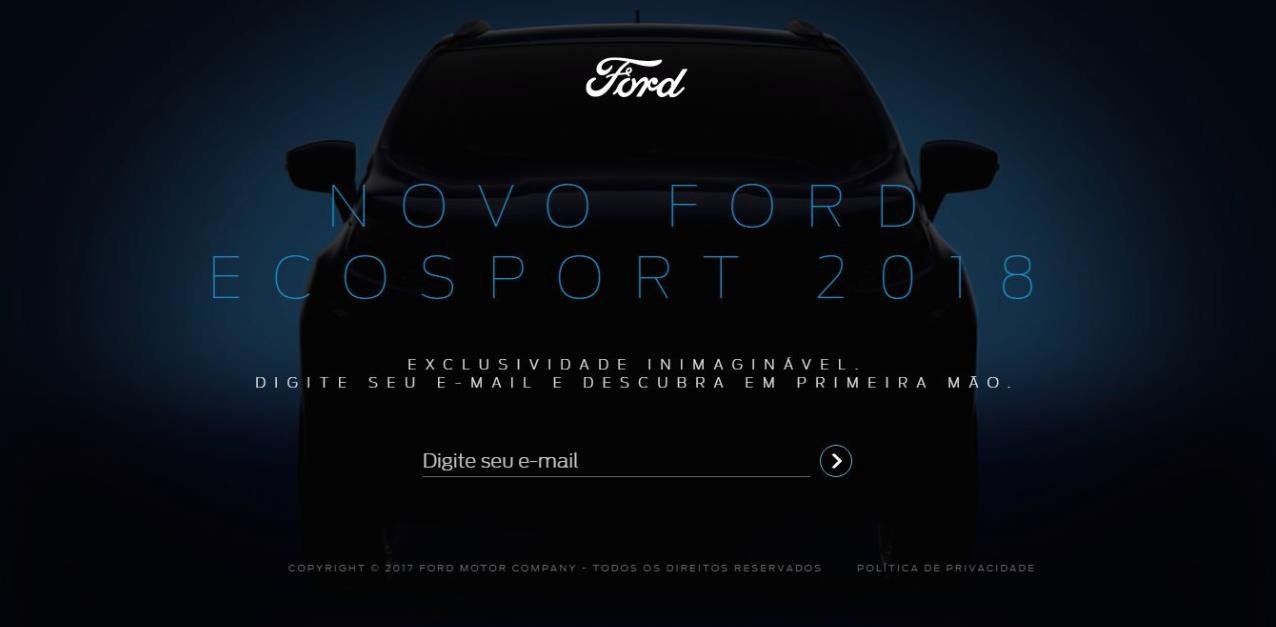 A Ford iniciou a campanha de pré-lançamento do Novo EcoSport com uma série de três filmes para as mídias sociais, que em apenas três semanas já somam cerca de 6 milhões de visualizações – veja aqui. A ação inclui também um site onde os interessados podem se cadastrar para conhecer as novidades do veículo e ver seu interior em 360 graus (www.ecosport.com.br).