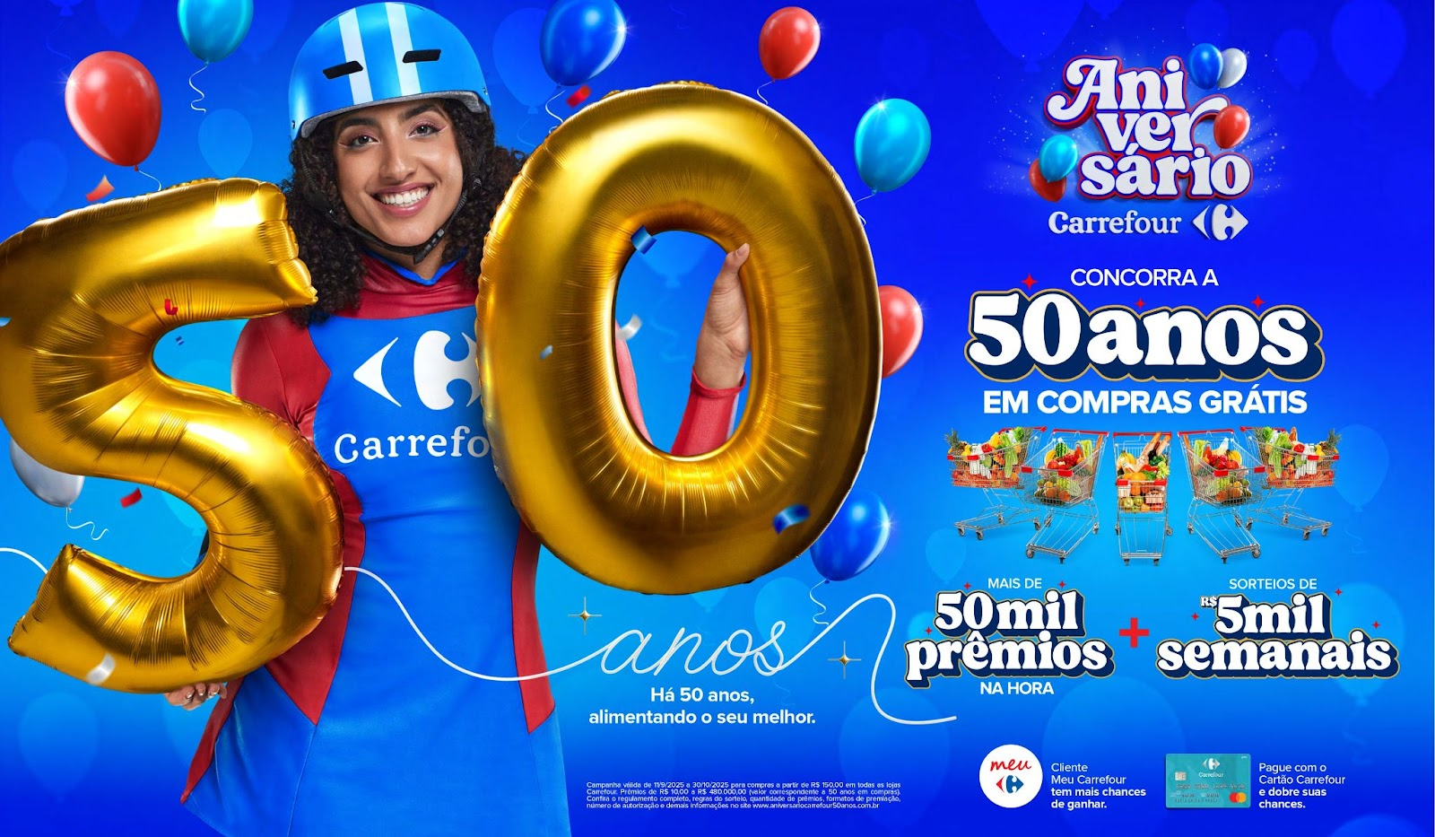 • 50 anos em compras grátis: sorteio final no dia 1º de novembro, com um prêmio equivalente a R$ 480 mil em um cartão físico, sem restrição de uso.