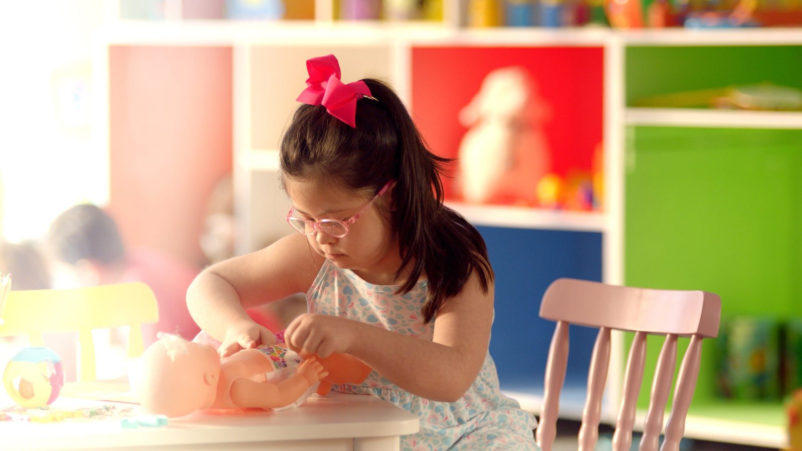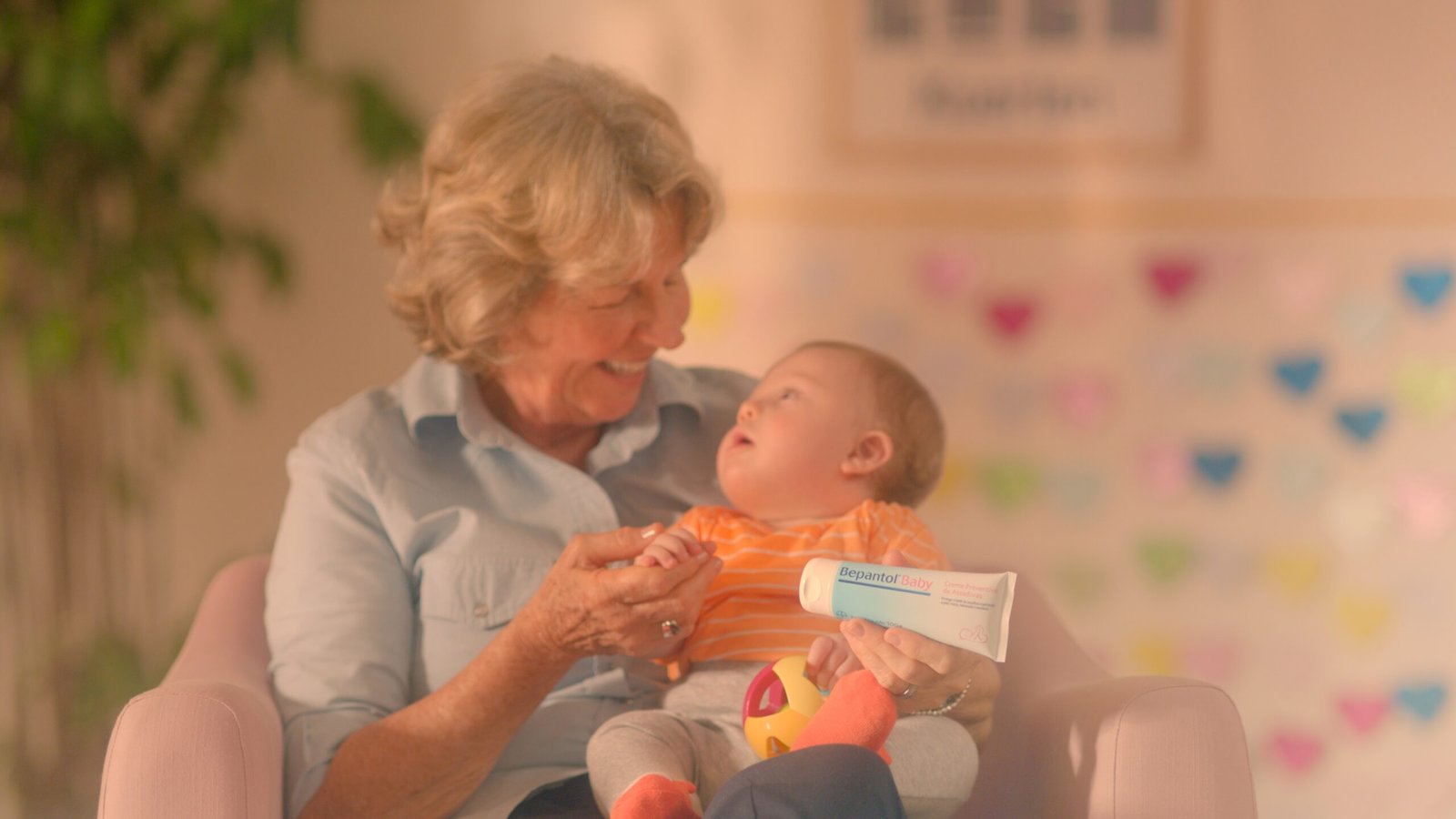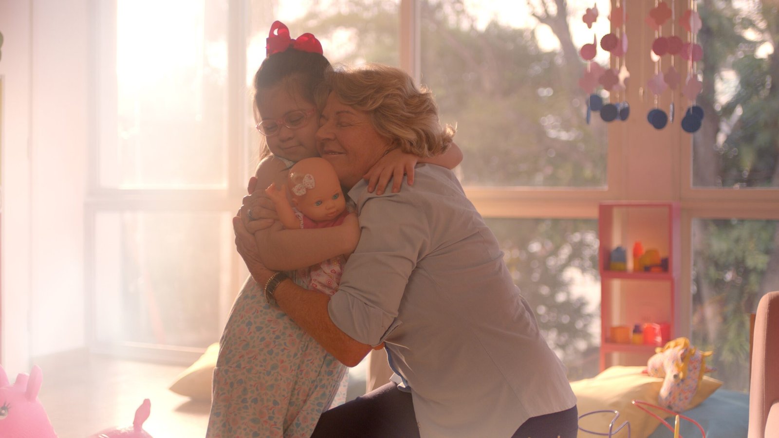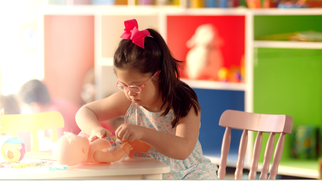 O filme de 30” se passa em um ambiente lúdico e repleto de brinquedos. Nas primeiras cenas, mostra uma menina com síndrome de Down cuidando de uma boneca, enquanto, em off, Alice Kuerten (mãe de Guga e presidente do instituto) diz: Gostar de cuidar é algo que nasce com a gente. Bepantol® Baby sempre valorizou isso.