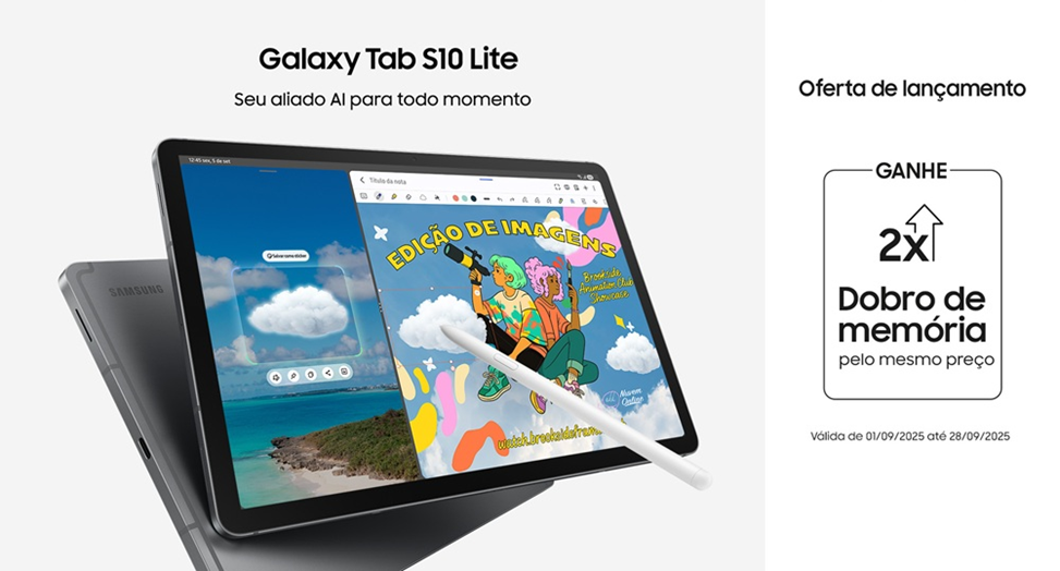 Para o lançamento do Galaxy Tab S10 Lite, a Samsung preparou uma oferta especial20 exclusiva no site da marca, disponibilizando o modelo com o dobro de memória entre os dias 1º e 28 de setembro de 2025. Os usuários que adquirirem o novo Galaxy Tab S10 Lite de 128GB no samsung.com/br/ durante esse período, leva a versão de 256GB pelo mesmo preço.