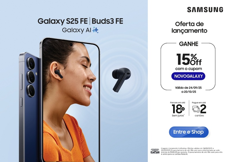 Além disso, usando o cupom NOVOGALAXY na Loja Online Samsung ou no aplicativo Samsung Shop, você ganha26 15% de desconto para adquirir o seu Galaxy S25 FE junto com os novos fones Galaxy Buds3 FE. O valor ainda pode ser parcelado em até 18 vezes sem juros. A ação é válida de 24 de setembro de 2025 a 20 de outubro de 2025.