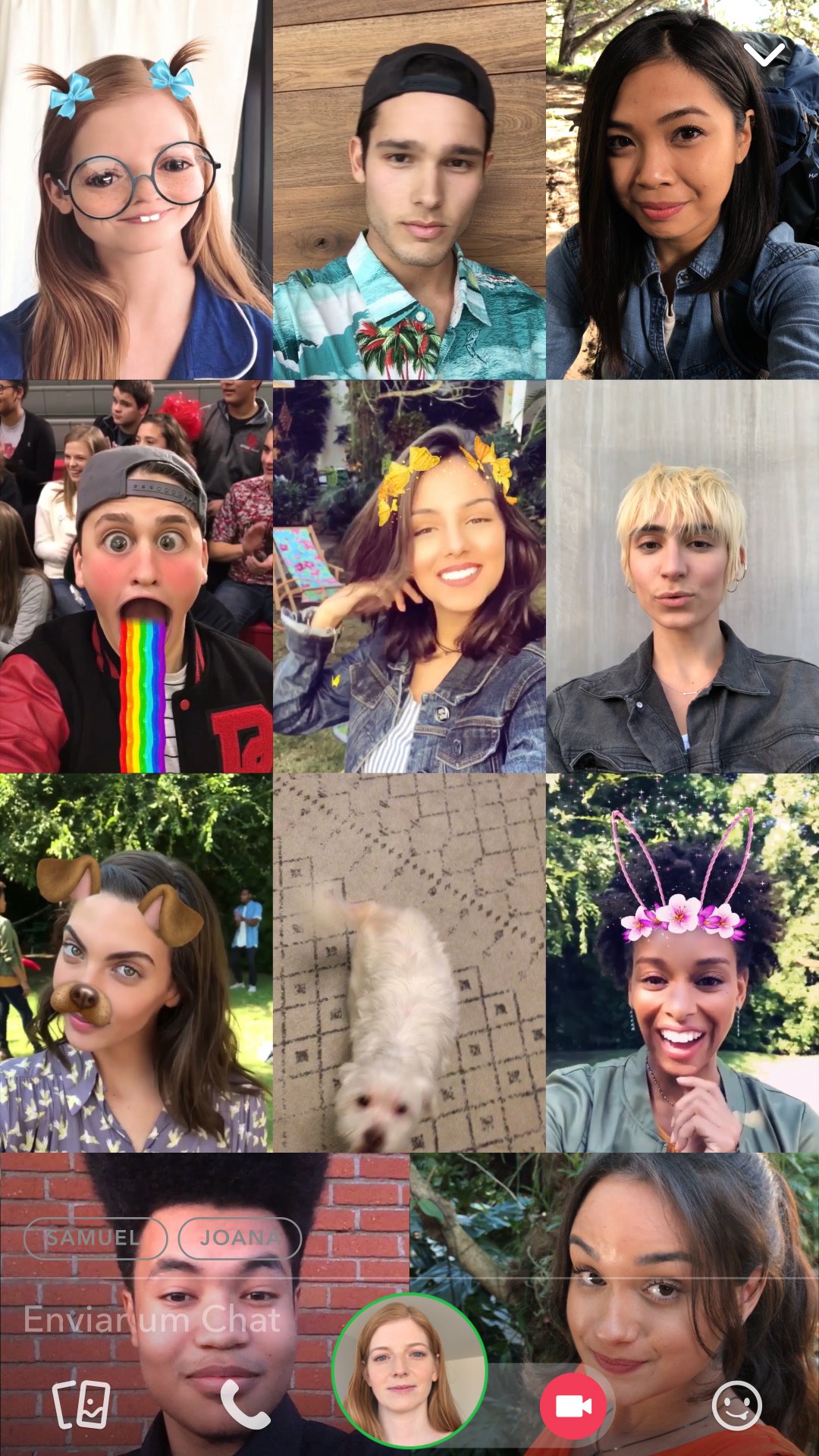 E, como sempre, durante um Vídeo Chat em Grupo, os Snapchatters podem se divertir com Lentes Faciais, vomitando arco-íris 🌈 ou virando cachorrinhos. 🐶